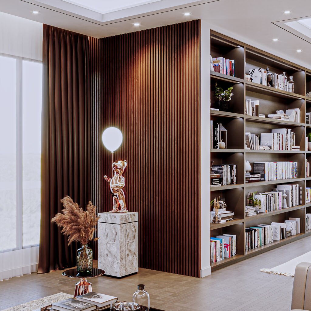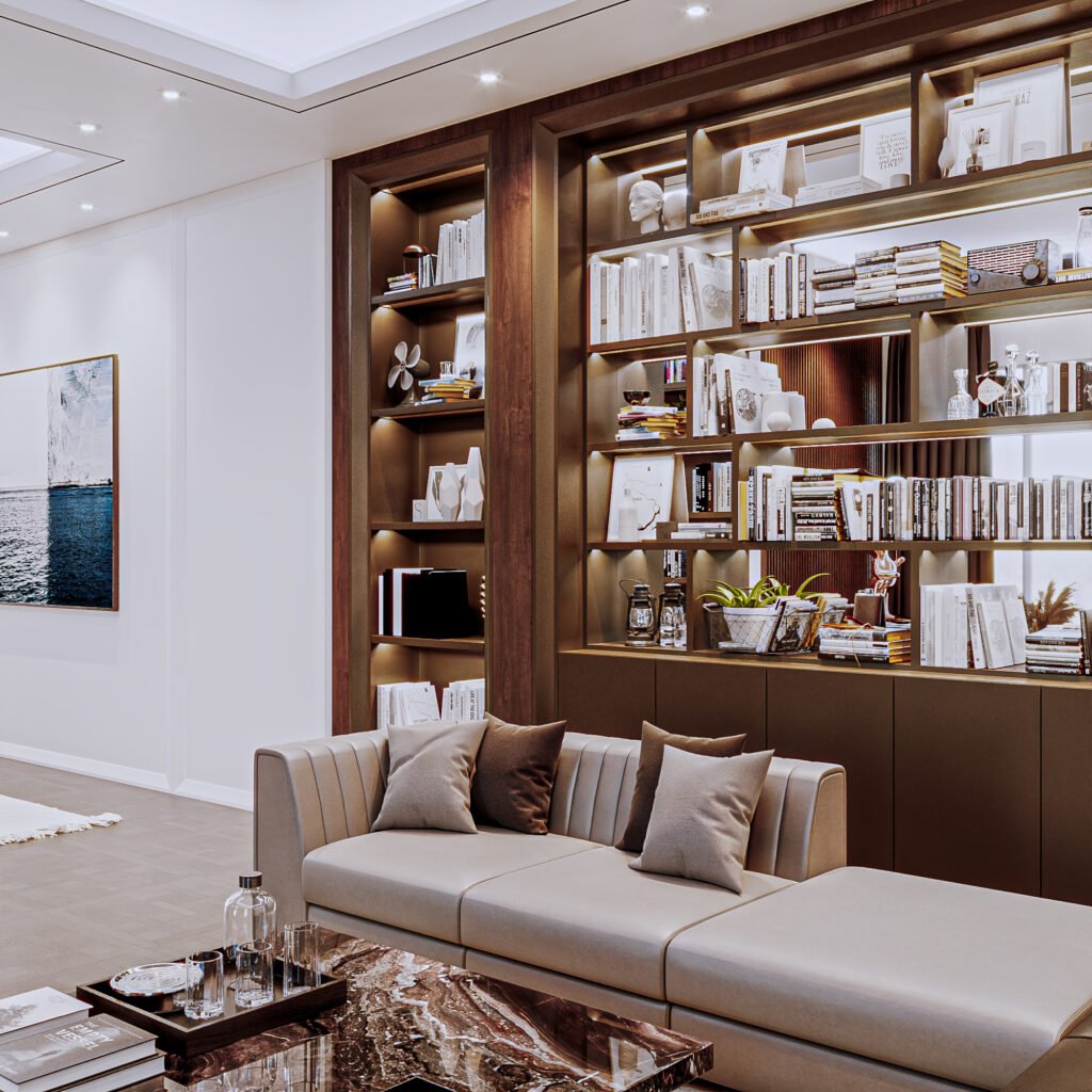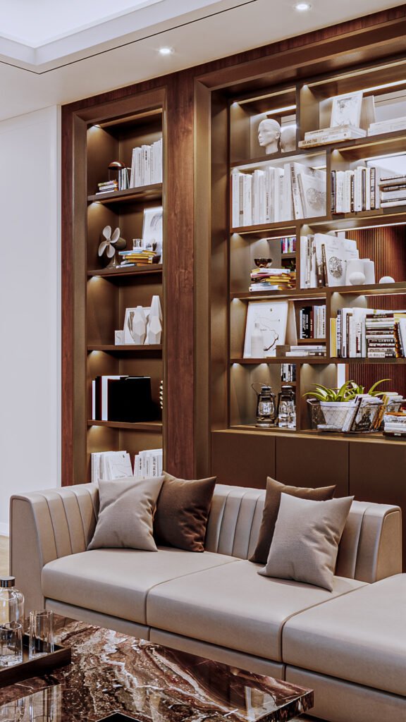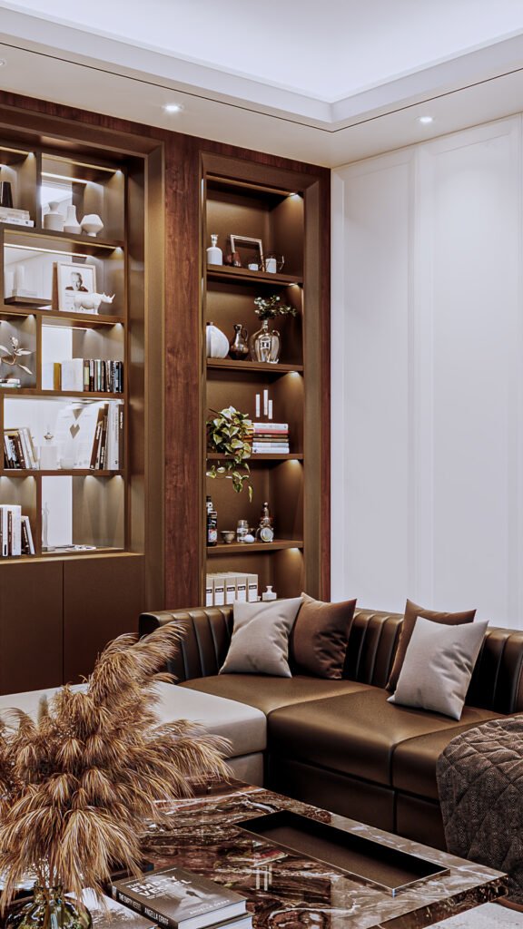 This design emphasizes cabinetry and shelving details. The concept highlights decorative elements and the refined architraves on the panels. The use of contrasting tones creates visual depth, making the space feel larger while allowing smooth movement throughout the room.
