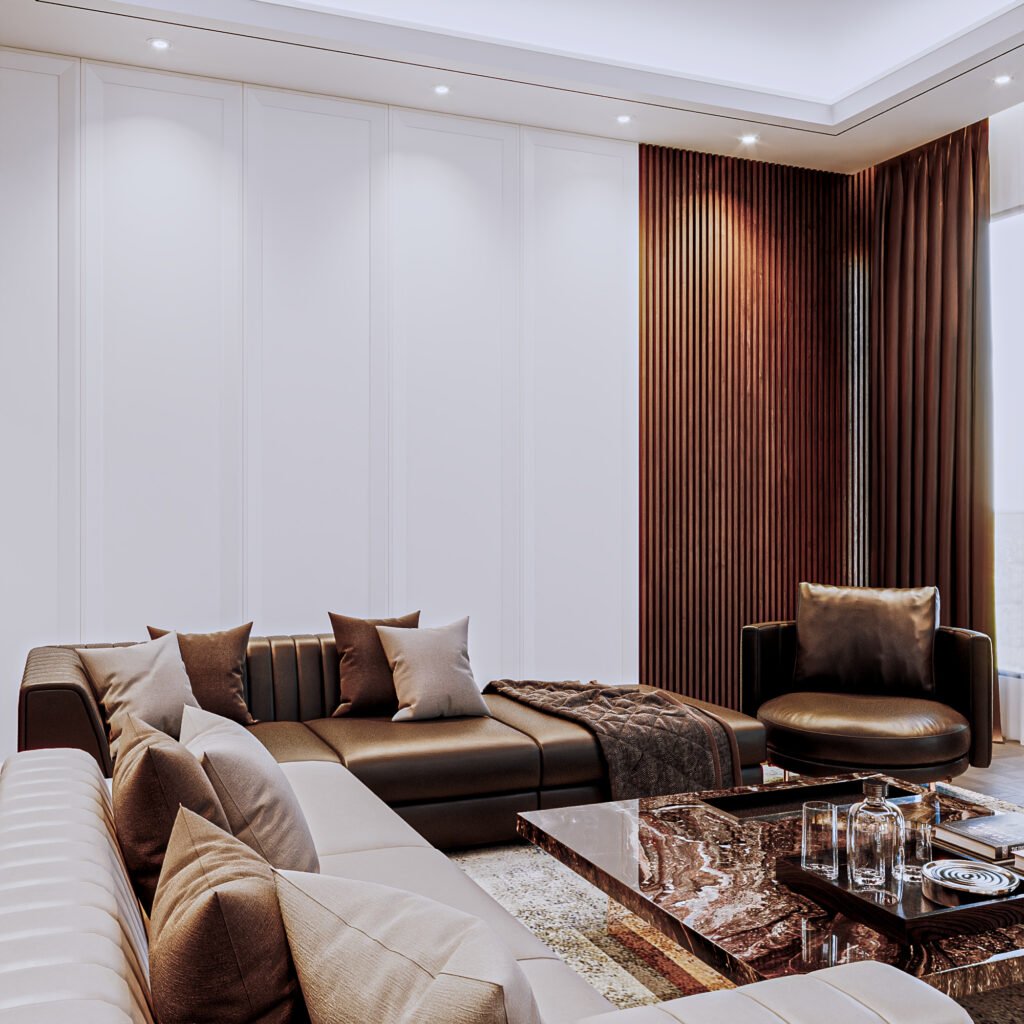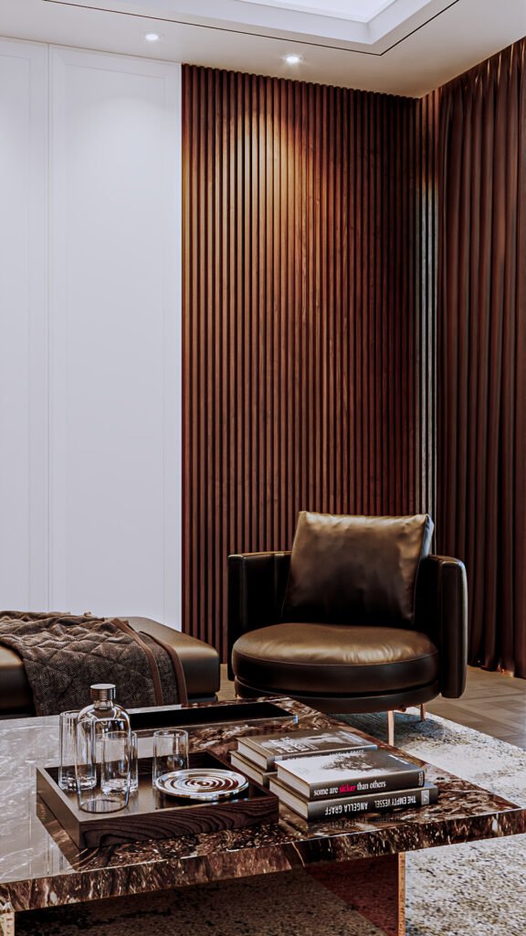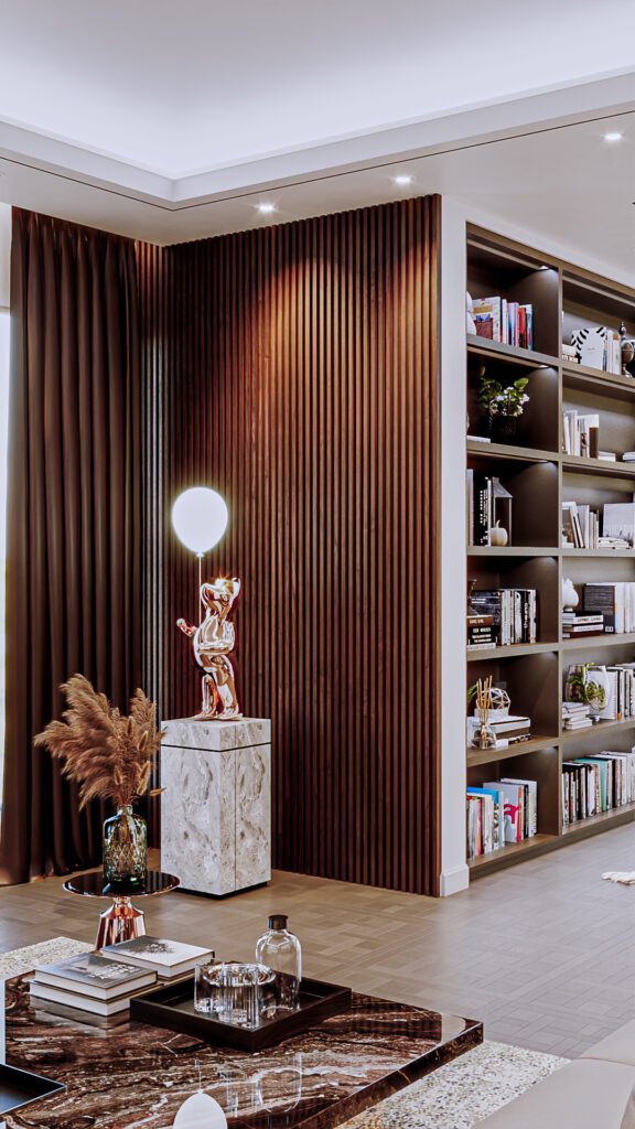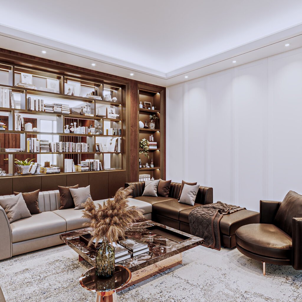 This design emphasizes cabinetry and shelving details. The concept highlights decorative elements and the refined architraves on the panels. The use of contrasting tones creates visual depth, making the space feel larger while allowing smooth movement throughout the room.